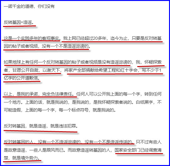 既然“怀疑探索者”一口咬定“如果地球上有任何一个反对转基因的帖子或者视频是没有造谣诽谤的,我,怀疑探索者,甘愿公开自裁,以谢天下”