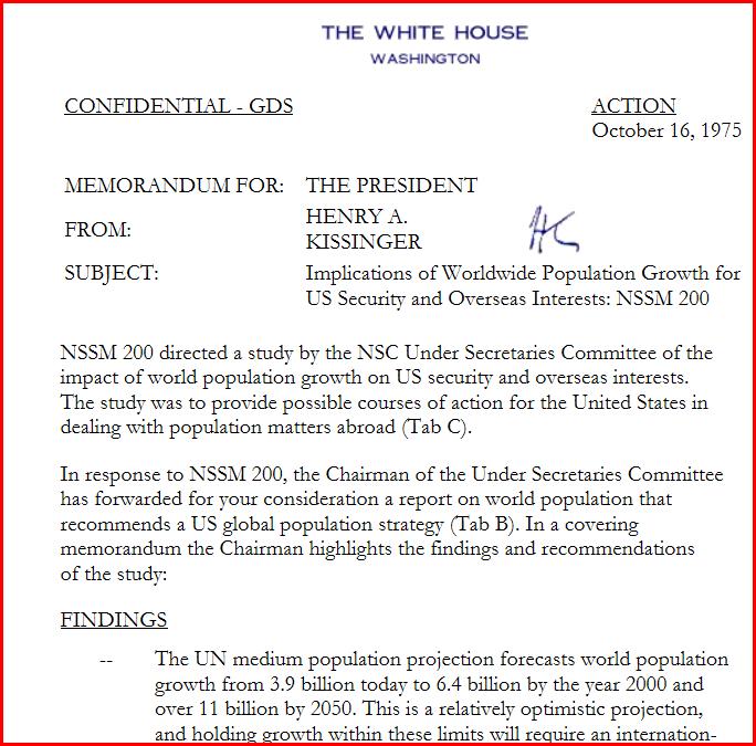 这个计划最典型的文件是《1974年国家安全研究备忘录第 200 号:世界人口增长对美国的安全及海外利益的意涵》(1974 National Security Study Memorandum 200: Implications of Worldwide Population Growth for U.S. Security and Overseas Interests, NSSM-200),也称为《基辛格报告》。