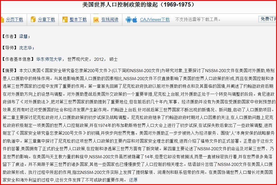 例如华东师范大学硕士论文《美国世界人口控制政策的缘起》
