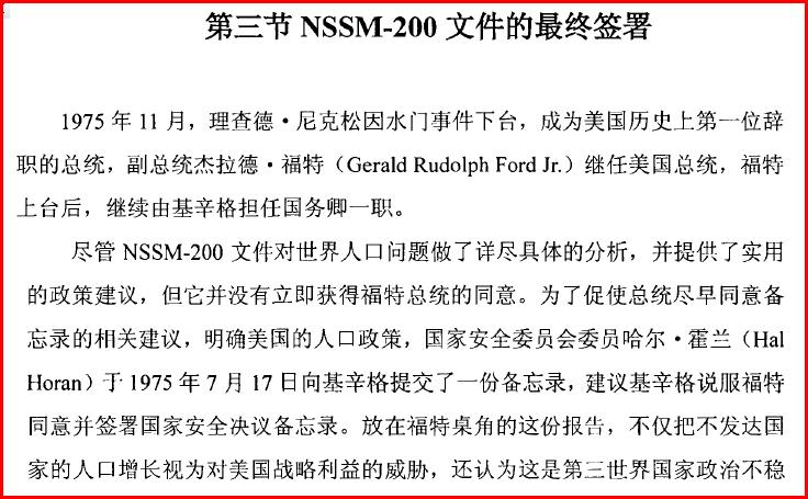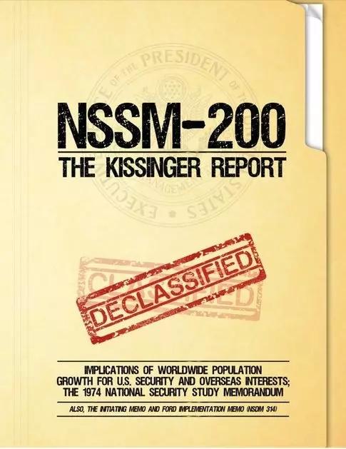 美国为了解决发展中国家人口过快问题,秘密制定“实施‘世界人口行动计划’以大幅降低世界人口数量。这一计划受到了天主教教会、除罗马尼亚之外的所有共产主义国家以及拉丁美洲和亚洲国家的坚决抵制。它们的抵制使美国的决策层意识到实施这个计划需要用一些隐蔽的手段。在这个背景下,亨利.基辛格被授权起草《NSSM-200》战略”。美国的新政策实际上就是“如果这些劣等人种妨碍我们获得充裕的廉价原材料,我们必须想办法除掉他们。”这就是《国家安全研究备忘录第200号》的真正含义,它只不过是用了冠冕堂皇的官方语言来表述而已。
