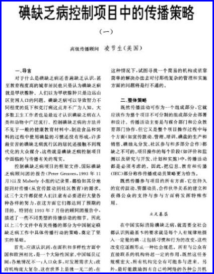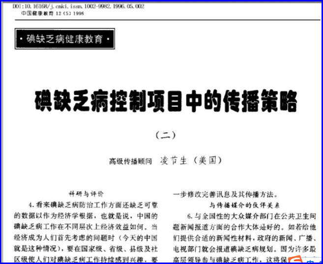 国际控制碘缺乏病理事会主席凌节生发表在《中国健康教育》1996年12(3)期的文章《碘缺乏病控制项目中的传播策略》, 如果说1993年联合国儿童基金会与中国盐业公司制定的《中国消除碘缺乏病食盐加碘现状分析和总体规划建议草案》是美国最明显、最直接主导中国补碘的铁证之一,那么这篇文章就是美国最明显、最直接主导中国补碘的铁证之二。