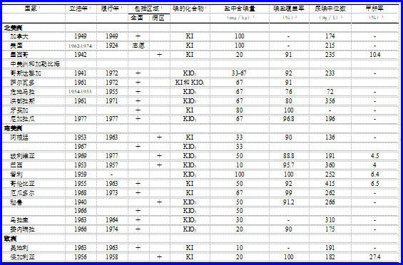 全世界50亿人口中,超过2/3的人为免受缺碘 的困扰而在使用碘盐。在南美洲,缺碘的状况在过 去的10多年里已经有了很大的改善;然而,在一些 国家发现摄碘量过高,这通过人群的高尿碘浓度得 以体现,在巴西尿碘>300 μg/L, 在智利则>500 pg/L。