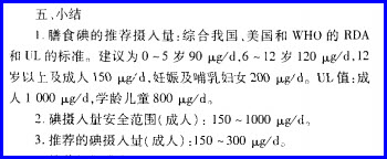 【证据】膳食碘的推荐摄人量:综合我国、美国和WHO的RDA和¨ 的标准。建议为0~5岁90 g/d,6~l2岁120 d,12岁以上及成人150µ g/d,妊娠及哺乳妇女200 txg/d。UL值:成人l 000 µg/d,学龄儿童800µ g/d。