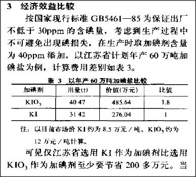 谈到了用碘化钾和碘酸钾补碘的经济效益比较,可以看出来用碘化钾补碘比用碘酸钾补碘便宜很多。当年(1994年)碘酸钾的价格是每吨12.5万元,碘化钾价格每吨8.5万元。