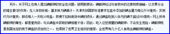 另外,关于网上也有人提出碘酸钾的安全性问题,钱明教授说,碘酸钾经过与食物中的还原物质接触,以及胃分泌的维生素C的作用,在人体吸收前,基本转为碘离子。天津市按国家标准要求在盐中添加的碘含量为每公斤30毫克,实测约为25毫克,假设每人一天吃10克盐,即便不扣除做饭中碘的损失,通过碘盐吃到人体内的碘不超过250微克。网上所传碘酸钾的毒性,都是毫克级,与从碘盐中获取的碘相差千倍。因此,吃入这些微量的碘酸钾,不会发生危险。碘酸钾既是我国法定的用于碘盐的添加剂之一,也得到了世界卫生组织的推荐,全世界有几十亿人食用含碘酸钾的碘盐。