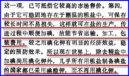 地方病专家于志恒说(碘酸钾)“由于它可稳固地存在于潮温的粗盐中,可保存较长时间不易损失,这样就可在盐的生产,传送过程中顺便加碘,故能节省运输、加工、包装费用。较之用碘化钾有明显的经济效益,稳定的预防效果。所以现在世界上,除去精盐中加碘尚用碘化钾外,几乎所有用粗盐制备碘盐的国家都已采用碘酸钾,而不再用碘化钾。”