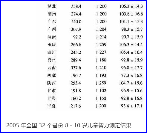 2005 年,卫生部为调查各地缺碘状况,研究人员测量、比较了各地儿童的智商,结果显示,中国人的智力呈现出明显的区域差异——上海、浙江、北京、新疆生产建设兵团遥遥领先,均超过 110。而西藏明显落后于其他省区,儿童平均智商仅为 77.3,智力落后的比例高达 32%