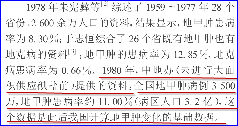 “1980年,中地办(未进行大面积供应碘盐前)提供的资料:全国地甲肿病例3500万,地甲肿患病率约11.00% (病区人口3.2亿),这个数据是此后我国计算地甲肿变化的基础”
