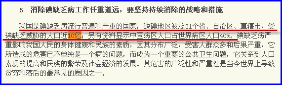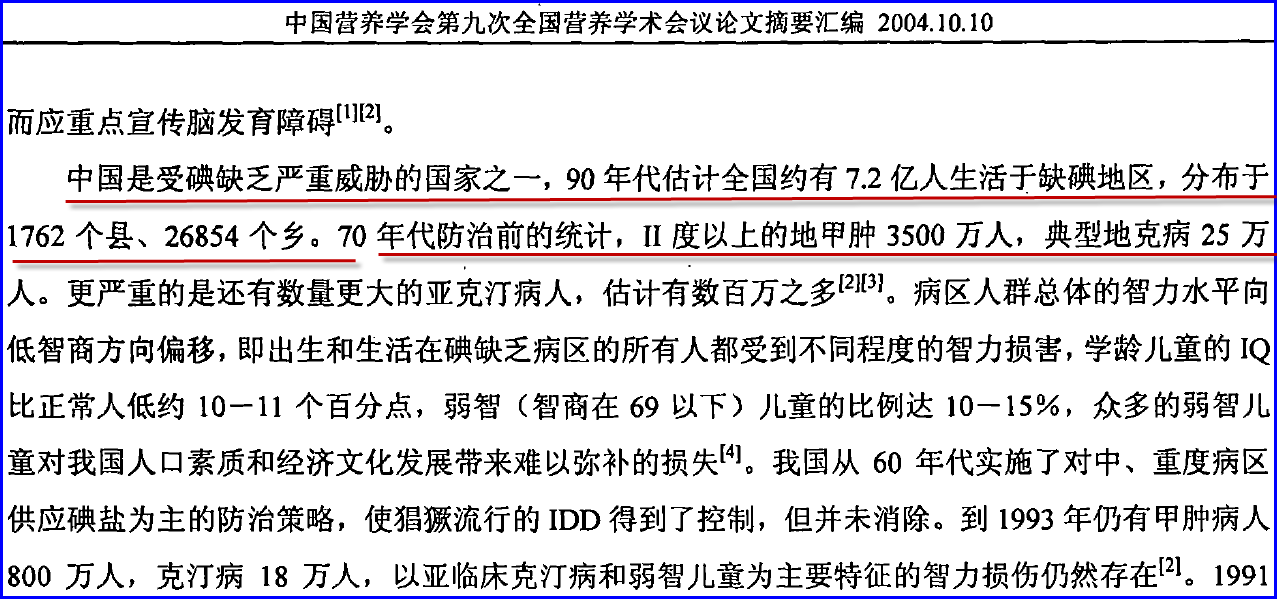 “中国是受碘缺乏严重威胁的国家之一,90年代估计全国约有7.2亿人生活于缺碘地区,分布于1762个县、26854个乡。”