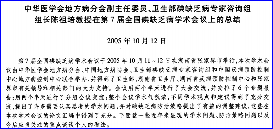 【论文题目】《中华医学会地方病分会副主任委员、卫生部碘缺乏病专家咨询组组长陈祖培教授在第7届全国碘缺乏病学术会议上的总结2005年1O月12 日》