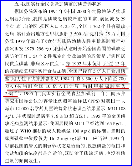 “据1992年末统计,在碘缺乏病区实行食盐加碘经过13年,全国已经有5亿人口食用碘盐,地方性甲状腺肿患者从1984年的3500万人下降至700万人,甲状腺肿的患病率为7 %(国际控制的标准是<5.0%。甲状腺肿的原因不是都源于碘缺乏)”